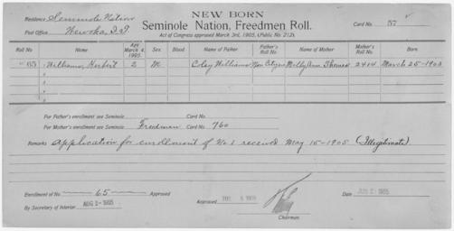 | Keywords: Enrollment for Seminole Census Card 57 - NARA - 267631.jpg Scope and content Name Alecky Type Parent Sex Male City of Residence Chickasaw Name Cheponoska Type By Blood Age 1 Sex Male Degree Indian Blood 3/4 Roll Number 212 City of Residence yh Name Hopoille Type By Blood Age 50 Sex Male Degree Indian Blood Full Roll Number 207 City of Residence th Name James Type By Blood Age 12 Sex Male Degree Indian Blood 3/4 Roll Number 210 City of Residence yh Name Lucy Type By Blood Age 38 Sex Female Degree Indian Blood 1/2 Roll Number 208 City of Residence yh Name Simon Peter Type Parent Sex Male City of Residence th Name Selma Type By Blood Age 20 Sex Male Degree Indian Blood 3/4 Roll Number 209 City of Residence yh Name Sissy Type By Blood Age 8 Sex Female Degree Indian Blood 3/4 Roll Number 211 City of Residence yh Name Tethlefka Type Parent Sex Female City of Residence yh Name Herbert Williams Type Newborn Freedmen-Rejected Age 2 Sex Male Degree Indian Blood Not Reported Roll Number 65 Post Office Wewoka General notes 267631 Local identifier 75-53A-SEMINOLE 57 Department of the Interior Office of Indian Affairs Office of the Commissioner to the Five Civilized Tribes 1893 - 1914 NARA's Southwest Region Fort Worth NRFA 1400 John Burgess Drive Fort Worth TX 76140 Record group Record Group 75 Records of the Bureau of Indian Affairs 1793 - 1999 Record group ARC 404 Enrollment Cards compiled 1898 - 1914 Series ARC 251747 File unit File unit ARC Variant control numbers NAIL Control Number NRFF-75-53A-22920<br /> NAIL Control Number NRFF-75-53A-27608<br /> NAIL Control Number NRFF-75-53A-36723<br /> NAIL Control Number NRFF-75-53A-37430<br /> NAIL Control Number NRFF-75-53A-40169<br /> NAIL Control Number NRFF-75-53A-44032<br /> NAIL Control Number NRFF-75-53A-46580<br /> NAIL Control Number NRFF-75-53A-47114<br /> NAIL Control Number NRFF-75-53A-48904<br /> NAIL Control Number NRFF-75-53A-52892<br /> NAIL Control Number NRFF-75-53A-SEMINOLE 57 Other versions <gallery> File Enrollment_for_Seminole_Census_Card_57_-_NARA_-_267631 tif tif File Enrollment_for_Seminole_Census_Card_57_-_NARA_-_267631 jpg jpg </gallery> NARA-cooperation PD-USGov Cherokee census cards Seminole census cards |