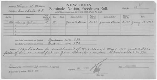 | Keywords: Enrollment for Seminole Census Card 63 - NARA - 267637.jpg Scope and content Name Carpitche Type By Blood Age 35 Sex Male Degree Indian Blood Full Roll Number 230 City of Residence th Name Charlie Type By Blood Age 2 Sex Male Degree Indian Blood Full Roll Number 234 City of Residence th Name Cheparney Type By Blood Age 12 Sex Male Degree Indian Blood Full Roll Number 232 City of Residence th Name Parsuk Harjoche Type Parent Sex Male City of Residence th Name Ponas Hinehah Type Parent Sex Male City of Residence th Name Kizzer Type Parent Sex Female City of Residence th Name Lina Type By Blood Age 15 Sex Female Degree Indian Blood Full City of Residence th Name Lydia Type Parent Sex Female City of Residence th Name Mulcy Type By Blood Age 36 Sex Female Degree Indian Blood Full Roll Number 231 City of Residence th Name Sillah Type By Blood Age 8 Sex Female Degree Indian Blood Full Roll Number 233 City of Residence th Name John Davis Type Newborn Freedmen-Rejected Age 5 Sex Male Degree Indian Blood Not Reported Roll Number 69 Post Office Emahaka General notes 267637 Local identifier 75-53A-SEMINOLE 63 Department of the Interior Office of Indian Affairs Office of the Commissioner to the Five Civilized Tribes 1893 - 1914 NARA's Southwest Region Fort Worth NRFA 1400 John Burgess Drive Fort Worth TX 76140 Record group Record Group 75 Records of the Bureau of Indian Affairs 1793 - 1999 Record group ARC 404 Enrollment Cards compiled 1898 - 1914 Series ARC 251747 File unit File unit ARC Variant control numbers NAIL Control Number NRFF-75-53A-27179<br /> NAIL Control Number NRFF-75-53A-27479<br /> NAIL Control Number NRFF-75-53A-27596<br /> NAIL Control Number NRFF-75-53A-35397<br /> NAIL Control Number NRFF-75-53A-36351<br /> NAIL Control Number NRFF-75-53A-38806<br /> NAIL Control Number NRFF-75-53A-39489<br /> NAIL Control Number NRFF-75-53A-40236<br /> NAIL Control Number NRFF-75-53A-42751<br /> NAIL Control Number NRFF-75-53A-46843<br /> NAIL Control Number NRFF-75-53A-52899<br /> NAIL Control Number NRFF-75-53A-SEMINOLE 63 Other versions <gallery> File Enrollment_for_Seminole_Census_Card_63_-_NARA_-_267637 tif tif File Enrollment_for_Seminole_Census_Card_63_-_NARA_-_267637 jpg jpg </gallery> NARA-cooperation PD-USGov Cherokee census cards Seminole census cards |