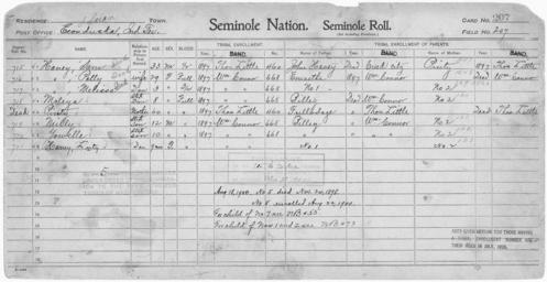 | Keywords: Enrollment for Seminole Census Card 207 - NARA - 267781.tif Scope and content Name Fullodage Type Parent Sex Male City of Residence tl Name John Haney Type Parent Sex Male City of Residence Creek Name Luty Haney Type By Blood Age 1 Sex Female Degree Indian Blood Full Roll Number 721 City of Residence wc Name Melissa Haney Type By Blood Age 3 Sex Female Degree Indian Blood Full Roll Number 717 City of Residence wc Name Polly Haney Type By Blood Age 29 Sex Female Degree Indian Blood Full Roll Number 716 City of Residence wc Name Sam Haney Type By Blood Age 33 Sex Male Degree Indian Blood 1/2 Roll Number 715 City of Residence tl Name Milly Type By Blood Age 12 Sex Male Degree Indian Blood Full Roll Number 719 City of Residence wc Name Moleya Type By Blood Age 8 Sex Female Degree Indian Blood Full Roll Number 718 City of Residence wc Name Pinty Type Parent Sex Female City of Residence tl Name Pinty Type By Blood Age 60 Sex Female Degree Indian Blood Full City of Residence tl Name Yowelle Type By Blood Age 10 Sex Male Degree Indian Blood Full Roll Number 720 City of Residence wc General notes 267781 Local identifier 75-53A-SEMINOLE 207 Department of the Interior Office of Indian Affairs Office of the Commissioner to the Five Civilized Tribes 1893 - 1914 NARA's Southwest Region Fort Worth NRFA 1400 John Burgess Drive Fort Worth TX 76140 Record group Record Group 75 Records of the Bureau of Indian Affairs 1793 - 1999 Record group ARC 404 Enrollment Cards compiled 1898 - 1914 Series ARC 251747 File unit File unit ARC Variant control numbers NAIL Control Number NRFF-75-53A-32707<br /> NAIL Control Number NRFF-75-53A-33933<br /> NAIL Control Number NRFF-75-53A-33937<br /> NAIL Control Number NRFF-75-53A-33939<br /> NAIL Control Number NRFF-75-53A-33943<br /> NAIL Control Number NRFF-75-53A-33946<br /> NAIL Control Number NRFF-75-53A-42186<br /> NAIL Control Number NRFF-75-53A-42368<br /> NAIL Control Number NRFF-75-53A-44191<br /> NAIL Control Number NRFF-75-53A-44192<br /> NAIL Control Number NRFF-75-53A-52619<br /> NAIL Control Number NRFF-75-53A-SEMINOLE 207 yes Other versions <gallery> File Enrollment_for_Seminole_Census_Card_207_-_NARA_-_267781 tif tif File Enrollment_for_Seminole_Census_Card_207_-_NARA_-_267781 jpg jpg </gallery> NARA-cooperation PD-USGov Seminole census cards NARA TIF images with categorized JPGs |
