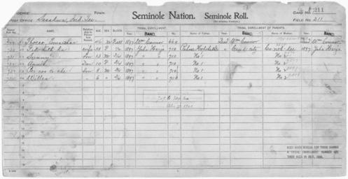 | Keywords: Enrollment for Seminole Census Card 211 - NARA - 267785.jpg Scope and content Name Annie Type By Blood Age 10 Sex Female Degree Indian Blood 3/4 Roll Number 732 City of Residence yh Name Conokkee Type Parent Sex Female City of Residence yh Name Fikhithka Type By Blood Age 38 Sex Female Degree Indian Blood 1/2 Roll Number 730 City of Residence yh Name Pahose Hopohethle Type Parent Sex Male City of Residence Creek Name Parnoscoche Type By Blood Age 8 Sex Male Degree Indian Blood 3/4 Roll Number 733 City of Residence yh Name Sunny Type By Blood Age 13 Sex Male Degree Indian Blood 3/4 Roll Number 731 City of Residence yh Name Emarthar Thocco Type By Blood Age 46 Sex Male Degree Indian Blood Full Roll Number 729 City of Residence wc Name Willea Type By Blood Age 6 Sex Male Degree Indian Blood 3/4 Roll Number 734 City of Residence yh General notes 267785 Local identifier 75-53A-SEMINOLE 211 Department of the Interior Office of Indian Affairs Office of the Commissioner to the Five Civilized Tribes 1893 - 1914 NARA's Southwest Region Fort Worth NRFA 1400 John Burgess Drive Fort Worth TX 76140 Record group Record Group 75 Records of the Bureau of Indian Affairs 1793 - 1999 Record group ARC 404 Enrollment Cards compiled 1898 - 1914 Series ARC 251747 File unit File unit ARC Variant control numbers NAIL Control Number NRFF-75-53A-23250<br /> NAIL Control Number NRFF-75-53A-28716<br /> NAIL Control Number NRFF-75-53A-31561<br /> NAIL Control Number NRFF-75-53A-36722<br /> NAIL Control Number NRFF-75-53A-43598<br /> NAIL Control Number NRFF-75-53A-48383<br /> NAIL Control Number NRFF-75-53A-49009<br /> NAIL Control Number NRFF-75-53A-51335<br /> NAIL Control Number NRFF-75-53A-SEMINOLE 211 Other versions <gallery> File Enrollment_for_Seminole_Census_Card_211_-_NARA_-_267785 tif tif File Enrollment_for_Seminole_Census_Card_211_-_NARA_-_267785 jpg jpg </gallery> NARA-cooperation PD-USGov Seminole census cards |