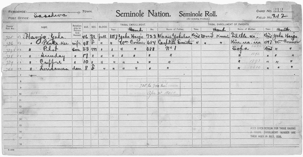 | Keywords: Enrollment for Seminole Census Card 212 - NARA - 267786.tif Scope and content Name Carpitche Emarther Type Parent Sex Male Name Cuffee Harjo Type By Blood Age 10 Sex Male Degree Indian Blood Full Roll Number 739 City of Residence wc Name Lousanna Harjo Type By Blood Age 8 Sex Female Degree Indian Blood Full Roll Number 740 City of Residence wc Name Petakee Harjo Type By Blood Age 48 Sex Female Degree Indian Blood Full Roll Number 736 City of Residence wc Name Pilot Harjo Type By Blood Age 23 Sex Male Degree Indian Blood Full Roll Number 737 City of Residence wc Name Sunday Harjo Type By Blood Age 17 Sex Male Degree Indian Blood Full Roll Number 738 City of Residence wc Name Yaha Harjo Type By Blood Age 46 Sex Male Degree Indian Blood Full Roll Number 735 City of Residence yh Name Kinnana Type Parent Sex Female City of Residence wc Name Sofa Type Parent Sex Female City of Residence wc Name Tilthleka Type Parent Sex Female City of Residence yh Name Woxie Yaholar Type Parent Sex Male General notes 267786 Local identifier 75-53A-SEMINOLE 212 Department of the Interior Office of Indian Affairs Office of the Commissioner to the Five Civilized Tribes 1893 - 1914 NARA's Southwest Region Fort Worth NRFA 1400 John Burgess Drive Fort Worth TX 76140 Record group Record Group 75 Records of the Bureau of Indian Affairs 1793 - 1999 Record group ARC 404 Enrollment Cards compiled 1898 - 1914 Series ARC 251747 File unit File unit ARC Variant control numbers NAIL Control Number NRFF-75-53A-30873<br /> NAIL Control Number NRFF-75-53A-34268<br /> NAIL Control Number NRFF-75-53A-34640<br /> NAIL Control Number NRFF-75-53A-34965<br /> NAIL Control Number NRFF-75-53A-34974<br /> NAIL Control Number NRFF-75-53A-35077<br /> NAIL Control Number NRFF-75-53A-35322<br /> NAIL Control Number NRFF-75-53A-38775<br /> NAIL Control Number NRFF-75-53A-47554<br /> NAIL Control Number NRFF-75-53A-49902<br /> NAIL Control Number NRFF-75-53A-52340<br /> NAIL Control Number NRFF-75-53A-SEMINOLE 212 yes Other versions <gallery> File Enrollment_for_Seminole_Census_Card_212_-_NARA_-_267786 tif tif File Enrollment_for_Seminole_Census_Card_212_-_NARA_-_267786 jpg jpg </gallery> NARA-cooperation PD-USGov Seminole census cards NARA TIF images with categorized JPGs |