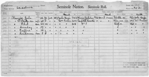 | Keywords: Enrollment for Seminole Census Card 212 - NARA - 267786.jpg Scope and content Name Carpitche Emarther Type Parent Sex Male Name Cuffee Harjo Type By Blood Age 10 Sex Male Degree Indian Blood Full Roll Number 739 City of Residence wc Name Lousanna Harjo Type By Blood Age 8 Sex Female Degree Indian Blood Full Roll Number 740 City of Residence wc Name Petakee Harjo Type By Blood Age 48 Sex Female Degree Indian Blood Full Roll Number 736 City of Residence wc Name Pilot Harjo Type By Blood Age 23 Sex Male Degree Indian Blood Full Roll Number 737 City of Residence wc Name Sunday Harjo Type By Blood Age 17 Sex Male Degree Indian Blood Full Roll Number 738 City of Residence wc Name Yaha Harjo Type By Blood Age 46 Sex Male Degree Indian Blood Full Roll Number 735 City of Residence yh Name Kinnana Type Parent Sex Female City of Residence wc Name Sofa Type Parent Sex Female City of Residence wc Name Tilthleka Type Parent Sex Female City of Residence yh Name Woxie Yaholar Type Parent Sex Male General notes 267786 Local identifier 75-53A-SEMINOLE 212 Department of the Interior Office of Indian Affairs Office of the Commissioner to the Five Civilized Tribes 1893 - 1914 NARA's Southwest Region Fort Worth NRFA 1400 John Burgess Drive Fort Worth TX 76140 Record group Record Group 75 Records of the Bureau of Indian Affairs 1793 - 1999 Record group ARC 404 Enrollment Cards compiled 1898 - 1914 Series ARC 251747 File unit File unit ARC Variant control numbers NAIL Control Number NRFF-75-53A-30873<br /> NAIL Control Number NRFF-75-53A-34268<br /> NAIL Control Number NRFF-75-53A-34640<br /> NAIL Control Number NRFF-75-53A-34965<br /> NAIL Control Number NRFF-75-53A-34974<br /> NAIL Control Number NRFF-75-53A-35077<br /> NAIL Control Number NRFF-75-53A-35322<br /> NAIL Control Number NRFF-75-53A-38775<br /> NAIL Control Number NRFF-75-53A-47554<br /> NAIL Control Number NRFF-75-53A-49902<br /> NAIL Control Number NRFF-75-53A-52340<br /> NAIL Control Number NRFF-75-53A-SEMINOLE 212 Other versions <gallery> File Enrollment_for_Seminole_Census_Card_212_-_NARA_-_267786 tif tif File Enrollment_for_Seminole_Census_Card_212_-_NARA_-_267786 jpg jpg </gallery> NARA-cooperation PD-USGov Seminole census cards |