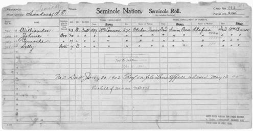 | Keywords: Enrollment for Seminole Census Card 214 - NARA - 267788.tif Scope and content Name Okchan Fixico Type Parent Sex Male City of Residence sb Name Johnie Type By Blood Age 20 Sex Male Degree Indian Blood Full Roll Number 746 City of Residence wc Name Klafisa Type Parent Sex Female City of Residence wc Name Parnoche Type By Blood Age 19 Sex Male Degree Indian Blood Full Roll Number 747 City of Residence wc Name Sally Type By Blood Age 7 Sex Female Degree Indian Blood Full Roll Number 748 City of Residence wc Name Williamkee Type By Blood Age 23 Sex Male Degree Indian Blood Full Roll Number 745 City of Residence wc General notes 267788 Local identifier 75-53A-SEMINOLE 214 Department of the Interior Office of Indian Affairs Office of the Commissioner to the Five Civilized Tribes 1893 - 1914 NARA's Southwest Region Fort Worth NRFA 1400 John Burgess Drive Fort Worth TX 76140 Record group Record Group 75 Records of the Bureau of Indian Affairs 1793 - 1999 Record group ARC 404 Enrollment Cards compiled 1898 - 1914 Series ARC 251747 File unit File unit ARC Variant control numbers NAIL Control Number NRFF-75-53A-32020<br /> NAIL Control Number NRFF-75-53A-37703<br /> NAIL Control Number NRFF-75-53A-38815<br /> NAIL Control Number NRFF-75-53A-43596<br /> NAIL Control Number NRFF-75-53A-45630<br /> NAIL Control Number NRFF-75-53A-51343<br /> NAIL Control Number NRFF-75-53A-SEMINOLE 214 yes Other versions <gallery> File Enrollment_for_Seminole_Census_Card_214_-_NARA_-_267788 tif tif File Enrollment_for_Seminole_Census_Card_214_-_NARA_-_267788 jpg jpg </gallery> NARA-cooperation PD-USGov Seminole census cards NARA TIF images with categorized JPGs |