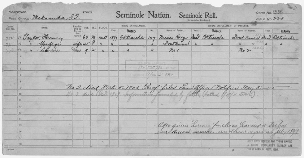 | Keywords: Enrollment for Seminole Census Card 228 - NARA - 267802.jpg Scope and content Name Micco Harjo Type Parent Sex Male City of Residence o Name Henry Taylor Type By Blood Age 63 Sex Male Degree Indian Blood Full Roll Number 774 City of Residence o Name Sarah Taylor Type By Blood Age 9 Sex Female Degree Indian Blood Full Roll Number 776 City of Residence o Name Yosfege Taylor Type By Blood Age 45 Sex Female Degree Indian Blood Full Roll Number 775 City of Residence o General notes 267802 Local identifier 75-53A-SEMINOLE 228 Department of the Interior Office of Indian Affairs Office of the Commissioner to the Five Civilized Tribes 1893 - 1914 NARA's Southwest Region Fort Worth NRFA 1400 John Burgess Drive Fort Worth TX 76140 Record group Record Group 75 Records of the Bureau of Indian Affairs 1793 - 1999 Record group ARC 404 Enrollment Cards compiled 1898 - 1914 Series ARC 251747 File unit File unit ARC Variant control numbers NAIL Control Number NRFF-75-53A-34740<br /> NAIL Control Number NRFF-75-53A-48691<br /> NAIL Control Number NRFF-75-53A-48755<br /> NAIL Control Number NRFF-75-53A-48781<br /> NAIL Control Number NRFF-75-53A-SEMINOLE 228 Other versions <gallery> File Enrollment_for_Seminole_Census_Card_228_-_NARA_-_267802 tif tif File Enrollment_for_Seminole_Census_Card_228_-_NARA_-_267802 jpg jpg </gallery> NARA-cooperation PD-USGov Seminole census cards |