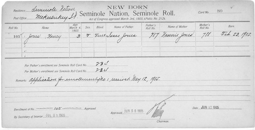 | Keywords: Enrollment for Seminole Census Card 80 - NARA - 267654.tif Scope and content Name Nancy Jones Type Newborn Age 3 Sex Female Degree Indian Blood FULL Roll Number 105 Post Office Mckusukey Name Cophoke Type Parent Sex Female City of Residence ee Name Contulla Harjo Type By Blood Age 45 Sex Male Degree Indian Blood Full Roll Number 282 City of Residence th Name Juffey Harjo Type By Blood Age 1 Sex Male Degree Indian Blood Full Roll Number 284 City of Residence ee Name Monachega Harjo Type By Blood Age 35 Sex Female Degree Indian Blood Full Roll Number 283 City of Residence ee Name Nokfah Harjo Type Parent Sex Male City of Residence ee Name Isesego Type Parent Sex Male City of Residence th Name Joanna Type By Blood Age 8 Sex Female Degree Indian Blood Full Roll Number 286 City of Residence ee Name Sallie Type By Blood Age 9 Sex Female Degree Indian Blood Full Roll Number 285 City of Residence ee Name Carolina Bennett Type Newborn Freedmen-Rejected Age 1 Sex Female Degree Indian Blood Not Reported Roll Number 121 Post Office Earlboro Name Willie Bennett Type Newborn Freedmen-Rejected Age 1 Sex Male Degree Indian Blood Not Reported Roll Number 122 Post Office Earlboro General notes 267654 Local identifier 75-53A-SEMINOLE 80 Department of the Interior Office of Indian Affairs Office of the Commissioner to the Five Civilized Tribes 1893 - 1914 NARA's Southwest Region Fort Worth NRFA 1400 John Burgess Drive Fort Worth TX 76140 Record group Record Group 75 Records of the Bureau of Indian Affairs 1793 - 1999 Record group ARC 404 Enrollment Cards compiled 1898 - 1914 Series ARC 251747 File unit File unit ARC Variant control numbers NAIL Control Number NRFF-75-53A-28860<br /> NAIL Control Number NRFF-75-53A-34239<br /> NAIL Control Number NRFF-75-53A-34531<br /> NAIL Control Number NRFF-75-53A-34781<br /> NAIL Control Number NRFF-75-53A-34861<br /> NAIL Control Number NRFF-75-53A-37112<br /> NAIL Control Number NRFF-75-53A-37644<br /> NAIL Control Number NRFF-75-53A-45620<br /> NAIL Control Number NRFF-75-53A-52638<br /> NAIL Control Number NRFF-75-53A-52925<br /> NAIL Control Number NRFF-75-53A-52926<br /> NAIL Control Number NRFF-75-53A-SEMINOLE 80 yes Other versions <gallery> File Enrollment_for_Seminole_Census_Card_80_-_NARA_-_267654 tif tif File Enrollment_for_Seminole_Census_Card_80_-_NARA_-_267654 jpg jpg </gallery> NARA-cooperation PD-USGov Cherokee census cards NARA TIF images with categorized JPGs |