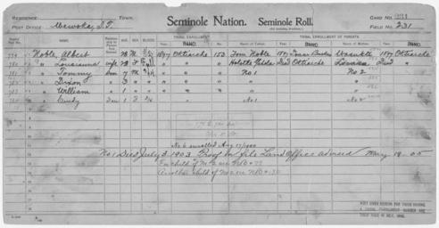 | Keywords: Enrollment for Seminole Census Card 231 - NARA - 267805.jpg Scope and content Name Albert Noble Type By Blood Age 28 Sex Male Degree Indian Blood 1/2 Roll Number 779 City of Residence o Name Cindy Noble Type By Blood Age 1 Sex Female Degree Indian Blood 3/4 Roll Number 784 City of Residence o Name Dixon Noble Type By Blood Age 3 Sex Male Degree Indian Blood 3/4 Roll Number 782 City of Residence o Name Lousianna Noble Type By Blood Age 28 Sex Female Degree Indian Blood Full Roll Number 780 City of Residence o Name Tom Noble Type Parent Sex Male City of Residence db Name Tommy Noble Type By Blood Age 7 Sex Male Degree Indian Blood 3/4 Roll Number 781 City of Residence o Name William Noble Type By Blood Age 1 Sex Male Degree Indian Blood 3/4 Roll Number 783 City of Residence o Name Wasukte Type Parent Sex Female City of Residence o Name Holotke Yahola Type Parent Sex Male City of Residence o General notes 267805 Local identifier 75-53A-SEMINOLE 231 Department of the Interior Office of Indian Affairs Office of the Commissioner to the Five Civilized Tribes 1893 - 1914 NARA's Southwest Region Fort Worth NRFA 1400 John Burgess Drive Fort Worth TX 76140 Record group Record Group 75 Records of the Bureau of Indian Affairs 1793 - 1999 Record group ARC 404 Enrollment Cards compiled 1898 - 1914 Series ARC 251747 File unit File unit ARC Variant control numbers NAIL Control Number NRFF-75-53A-43196<br /> NAIL Control Number NRFF-75-53A-43201<br /> NAIL Control Number NRFF-75-53A-43203<br /> NAIL Control Number NRFF-75-53A-43210<br /> NAIL Control Number NRFF-75-53A-43224<br /> NAIL Control Number NRFF-75-53A-43230<br /> NAIL Control Number NRFF-75-53A-43234<br /> NAIL Control Number NRFF-75-53A-50756<br /> NAIL Control Number NRFF-75-53A-52136<br /> NAIL Control Number NRFF-75-53A-SEMINOLE 231 Other versions <gallery> File Enrollment_for_Seminole_Census_Card_231_-_NARA_-_267805 tif tif File Enrollment_for_Seminole_Census_Card_231_-_NARA_-_267805 jpg jpg </gallery> NARA-cooperation PD-USGov Seminole census cards |