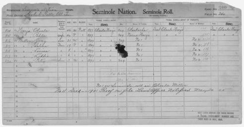 | Keywords: Enrollment for Seminole Census Card 240 - NARA - 267814.tif Scope and content Name Nocus Harjo Type Parent Sex Male City of Residence oh Name Okoske Harjo Type By Blood Age 46 Sex Male Degree Indian Blood Full Roll Number 814 City of Residence oh Name Pahke Harjo Type By Blood Age 40 Sex Female Degree Indian Blood Full Roll Number 815 City of Residence oh Name Josey Miller Type By Blood Age 21 Sex Male Degree Indian Blood Full Roll Number 816 City of Residence oh Name Liddie Miller Type By Blood Age 6 Sex Female Degree Indian Blood Full Roll Number 819 City of Residence oh Name Louisa Miller Type By Blood Age 8 Sex Female Degree Indian Blood Full Roll Number 818 City of Residence oh Name Peter Miller Type By Blood Age 3 Sex Male Degree Indian Blood Full Roll Number 820 City of Residence oh Name Salina Miller Type By Blood Age 19 Sex Female Degree Indian Blood Full Roll Number 817 City of Residence oh General notes 267814 Local identifier 75-53A-SEMINOLE 240 Department of the Interior Office of Indian Affairs Office of the Commissioner to the Five Civilized Tribes 1893 - 1914 NARA's Southwest Region Fort Worth NRFA 1400 John Burgess Drive Fort Worth TX 76140 Record group Record Group 75 Records of the Bureau of Indian Affairs 1793 - 1999 Record group ARC 404 Enrollment Cards compiled 1898 - 1914 Series ARC 251747 File unit File unit ARC Variant control numbers NAIL Control Number NRFF-75-53A-34858<br /> NAIL Control Number NRFF-75-53A-34909<br /> NAIL Control Number NRFF-75-53A-34928<br /> NAIL Control Number NRFF-75-53A-42079<br /> NAIL Control Number NRFF-75-53A-42084<br /> NAIL Control Number NRFF-75-53A-42092<br /> NAIL Control Number NRFF-75-53A-42108<br /> NAIL Control Number NRFF-75-53A-42116<br /> NAIL Control Number NRFF-75-53A-SEMINOLE 240 yes Other versions <gallery> File Enrollment_for_Seminole_Census_Card_240_-_NARA_-_267814 tif tif File Enrollment_for_Seminole_Census_Card_240_-_NARA_-_267814 jpg jpg </gallery> NARA-cooperation PD-USGov Seminole census cards NARA TIF images with categorized JPGs |