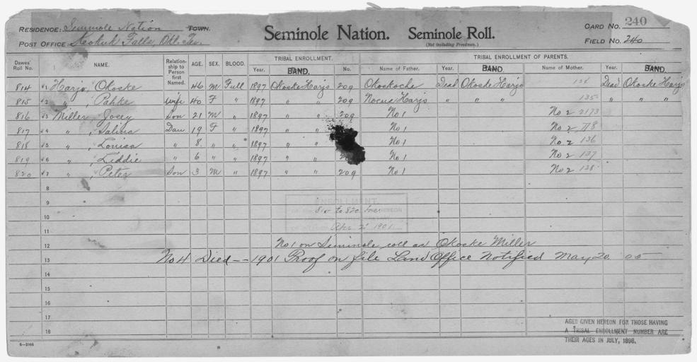 | Keywords: Enrollment for Seminole Census Card 240 - NARA - 267814.jpg Scope and content Name Nocus Harjo Type Parent Sex Male City of Residence oh Name Okoske Harjo Type By Blood Age 46 Sex Male Degree Indian Blood Full Roll Number 814 City of Residence oh Name Pahke Harjo Type By Blood Age 40 Sex Female Degree Indian Blood Full Roll Number 815 City of Residence oh Name Josey Miller Type By Blood Age 21 Sex Male Degree Indian Blood Full Roll Number 816 City of Residence oh Name Liddie Miller Type By Blood Age 6 Sex Female Degree Indian Blood Full Roll Number 819 City of Residence oh Name Louisa Miller Type By Blood Age 8 Sex Female Degree Indian Blood Full Roll Number 818 City of Residence oh Name Peter Miller Type By Blood Age 3 Sex Male Degree Indian Blood Full Roll Number 820 City of Residence oh Name Salina Miller Type By Blood Age 19 Sex Female Degree Indian Blood Full Roll Number 817 City of Residence oh General notes 267814 Local identifier 75-53A-SEMINOLE 240 Department of the Interior Office of Indian Affairs Office of the Commissioner to the Five Civilized Tribes 1893 - 1914 NARA's Southwest Region Fort Worth NRFA 1400 John Burgess Drive Fort Worth TX 76140 Record group Record Group 75 Records of the Bureau of Indian Affairs 1793 - 1999 Record group ARC 404 Enrollment Cards compiled 1898 - 1914 Series ARC 251747 File unit File unit ARC Variant control numbers NAIL Control Number NRFF-75-53A-34858<br /> NAIL Control Number NRFF-75-53A-34909<br /> NAIL Control Number NRFF-75-53A-34928<br /> NAIL Control Number NRFF-75-53A-42079<br /> NAIL Control Number NRFF-75-53A-42084<br /> NAIL Control Number NRFF-75-53A-42092<br /> NAIL Control Number NRFF-75-53A-42108<br /> NAIL Control Number NRFF-75-53A-42116<br /> NAIL Control Number NRFF-75-53A-SEMINOLE 240 Other versions <gallery> File Enrollment_for_Seminole_Census_Card_240_-_NARA_-_267814 tif tif File Enrollment_for_Seminole_Census_Card_240_-_NARA_-_267814 jpg jpg </gallery> NARA-cooperation PD-USGov Seminole census cards |