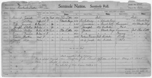 | Keywords: Enrollment for Seminole Census Card 292 - NARA - 267866.jpg Scope and content Name Betsey Canard Type By Blood Age 55 Sex Female Degree Indian Blood Full Roll Number 1002 City of Residence oh Name Josiah Canard Type By Blood Age 58 Sex Male Degree Indian Blood Full Roll Number 1001 City of Residence tl Name Jennie Fife Type By Blood Age 25 Sex Female Degree Indian Blood 1/2 Roll Number 1003 City of Residence oh Name Hettie Fixico Type By Blood Age 8 Sex Female Degree Indian Blood Full Roll Number 1007 City of Residence tl Name Nokus Fixico Type Parent Sex Male City of Residence k Name Stella Hoseph Type By Blood Age 1 Sex Female Degree Indian Blood 1/4 Roll Number 1004 City of Residence oh Name Alice Joseph Type By Blood Age 1 Sex Female Degree Indian Blood 1/4 Roll Number 1008 City of Residence oh Name W L Joseph Type Parent Sex Male City of Residence k Name Kochukney Type Parent Sex Male City of Residence oh Name Lousanna Type Parent Sex Female City of Residence oh Name Nessie Yamie Type By Blood Age 17 Sex Female Degree Indian Blood Full Roll Number 1006 City of Residence tl Name Willie Yamie Type By Blood Age 18 Sex Male Degree Indian Blood Full Roll Number 1005 City of Residence tl General notes 267866 Local identifier 75-53A-SEMINOLE 292 Department of the Interior Office of Indian Affairs Office of the Commissioner to the Five Civilized Tribes 1893 - 1914 NARA's Southwest Region Fort Worth NRFA 1400 John Burgess Drive Fort Worth TX 76140 Record group Record Group 75 Records of the Bureau of Indian Affairs 1793 - 1999 Record group ARC 404 Enrollment Cards compiled 1898 - 1914 Series ARC 251747 File unit File unit ARC Variant control numbers NAIL Control Number NRFF-75-53A-26998<br /> NAIL Control Number NRFF-75-53A-27021<br /> NAIL Control Number NRFF-75-53A-31484<br /> NAIL Control Number NRFF-75-53A-31908<br /> NAIL Control Number NRFF-75-53A-32014<br /> NAIL Control Number NRFF-75-53A-36755<br /> NAIL Control Number NRFF-75-53A-38162<br /> NAIL Control Number NRFF-75-53A-38177<br /> NAIL Control Number NRFF-75-53A-38883<br /> NAIL Control Number NRFF-75-53A-39945<br /> NAIL Control Number NRFF-75-53A-52355<br /> NAIL Control Number NRFF-75-53A-52356<br /> NAIL Control Number NRFF-75-53A-SEMINOLE 292 Other versions <gallery> File Enrollment_for_Seminole_Census_Card_292_-_NARA_-_267866 tif tif File Enrollment_for_Seminole_Census_Card_292_-_NARA_-_267866 jpg jpg </gallery> NARA-cooperation PD-USGov Seminole census cards |
