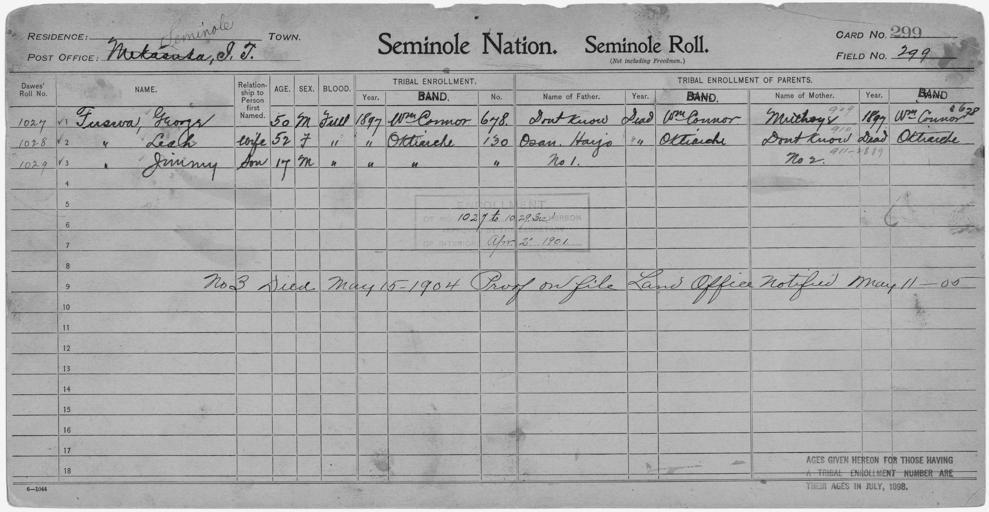 | Keywords: Enrollment for Seminole Census Card 299 - NARA - 267873.jpg Scope and content Name George Fuswa Type By Blood Age 50 Sex Male Degree Indian Blood Full Roll Number 1027 City of Residence wc Name Jimmy Fuswa Type By Blood Age 17 Sex Male Degree Indian Blood Full Roll Number 1029 City of Residence o Name Leah Fuswa Type By Blood Age 52 Sex Female Degree Indian Blood Full Roll Number 1028 City of Residence o Name Osan Harjo Type Parent Sex Male City of Residence o Name Muthoy Type Parent Sex Female City of Residence wc General notes 267873 Local identifier 75-53A-SEMINOLE 299 Department of the Interior Office of Indian Affairs Office of the Commissioner to the Five Civilized Tribes 1893 - 1914 NARA's Southwest Region Fort Worth NRFA 1400 John Burgess Drive Fort Worth TX 76140 Record group Record Group 75 Records of the Bureau of Indian Affairs 1793 - 1999 Record group ARC 404 Enrollment Cards compiled 1898 - 1914 Series ARC 251747 File unit File unit ARC Variant control numbers NAIL Control Number NRFF-75-53A-32765<br /> NAIL Control Number NRFF-75-53A-32766<br /> NAIL Control Number NRFF-75-53A-32768<br /> NAIL Control Number NRFF-75-53A-34917<br /> NAIL Control Number NRFF-75-53A-42873<br /> NAIL Control Number NRFF-75-53A-SEMINOLE 299 Other versions <gallery> File Enrollment_for_Seminole_Census_Card_299_-_NARA_-_267873 tif tif File Enrollment_for_Seminole_Census_Card_299_-_NARA_-_267873 jpg jpg </gallery> NARA-cooperation PD-USGov Seminole census cards |