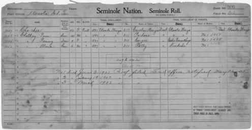 | Keywords: Enrollment for Seminole Census Card 306 - NARA - 267880.tif Scope and content Name Chochee Type By Blood Age 40 Sex Female Degree Indian Blood Full Roll Number 1047 City of Residence oh Name Alma Chotkey Type By Blood Age 6 Sex Male Degree Indian Blood Full Roll Number 1050 City of Residence oh Name Fanny Chotkey Type By Blood Age 9 Sex Female Degree Indian Blood Full Roll Number 1049 City of Residence oh Name Tom Chotkey Type By Blood Age 14 Sex Male Degree Indian Blood Full Roll Number 1048 City of Residence oh Name Cogee Type Parent Sex Male City of Residence ee Name Carchar Harjo Type Parent Sex Male City of Residence oh Name Parhose Type Parent Sex Male City of Residence oh Name Rolly Type Parent Sex Male City of Residence k General notes 267880 Local identifier 75-53A-SEMINOLE 306 Department of the Interior Office of Indian Affairs Office of the Commissioner to the Five Civilized Tribes 1893 - 1914 NARA's Southwest Region Fort Worth NRFA 1400 John Burgess Drive Fort Worth TX 76140 Record group Record Group 75 Records of the Bureau of Indian Affairs 1793 - 1999 Record group ARC 404 Enrollment Cards compiled 1898 - 1914 Series ARC 251747 File unit File unit ARC Variant control numbers NAIL Control Number NRFF-75-53A-27947<br /> NAIL Control Number NRFF-75-53A-28001<br /> NAIL Control Number NRFF-75-53A-28002<br /> NAIL Control Number NRFF-75-53A-28005<br /> NAIL Control Number NRFF-75-53A-28410<br /> NAIL Control Number NRFF-75-53A-34144<br /> NAIL Control Number NRFF-75-53A-43566<br /> NAIL Control Number NRFF-75-53A-45414<br /> NAIL Control Number NRFF-75-53A-SEMINOLE 306 yes Other versions <gallery> File Enrollment_for_Seminole_Census_Card_306_-_NARA_-_267880 tif tif File Enrollment_for_Seminole_Census_Card_306_-_NARA_-_267880 jpg jpg </gallery> NARA-cooperation PD-USGov Seminole census cards NARA TIF images with categorized JPGs |