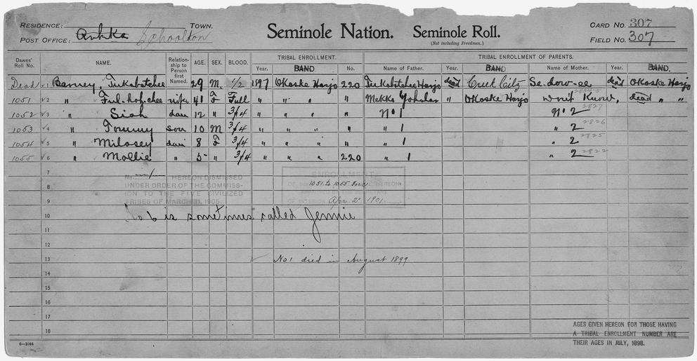 | Keywords: Enrollment for Seminole Census Card 307 - NARA - 267881.tif Scope and content Name Fulhohchee Barney Type By Blood Age 41 Sex Female Degree Indian Blood Full Roll Number 1051 City of Residence oh Name Milosey Barney Type By Blood Age 8 Sex Female Degree Indian Blood 3/4 Roll Number 1054 City of Residence oh Name Mollie Barney Type By Blood Age 5 Sex Female Degree Indian Blood 3/4 Roll Number 1055 City of Residence oh Name Siah Barney Type By Blood Age 12 Sex Female Degree Indian Blood 3/4 Roll Number 1052 City of Residence oh Name Tommy Barney Type By Blood Age 10 Sex Male Degree Indian Blood 3/4 Roll Number 1053 City of Residence oh Name Tukabatchee Barney Type By Blood Age 29 Sex Male Degree Indian Blood 1/2 City of Residence oh Name Sedowee Type Parent Sex Female City of Residence oh Name Mekko Yohaler Type Parent Sex Male City of Residence oh General notes 267881 Local identifier 75-53A-SEMINOLE 307 Department of the Interior Office of Indian Affairs Office of the Commissioner to the Five Civilized Tribes 1893 - 1914 NARA's Southwest Region Fort Worth NRFA 1400 John Burgess Drive Fort Worth TX 76140 Record group Record Group 75 Records of the Bureau of Indian Affairs 1793 - 1999 Record group ARC 404 Enrollment Cards compiled 1898 - 1914 Series ARC 251747 File unit File unit ARC Variant control numbers NAIL Control Number NRFF-75-53A-24153<br /> NAIL Control Number NRFF-75-53A-24154<br /> NAIL Control Number NRFF-75-53A-24155<br /> NAIL Control Number NRFF-75-53A-24156<br /> NAIL Control Number NRFF-75-53A-24157<br /> NAIL Control Number NRFF-75-53A-24158<br /> NAIL Control Number NRFF-75-53A-46429<br /> NAIL Control Number NRFF-75-53A-52577<br /> NAIL Control Number NRFF-75-53A-SEMINOLE 307 yes Other versions <gallery> File Enrollment_for_Seminole_Census_Card_307_-_NARA_-_267881 tif tif File Enrollment_for_Seminole_Census_Card_307_-_NARA_-_267881 jpg jpg </gallery> NARA-cooperation PD-USGov Seminole census cards NARA TIF images with categorized JPGs |