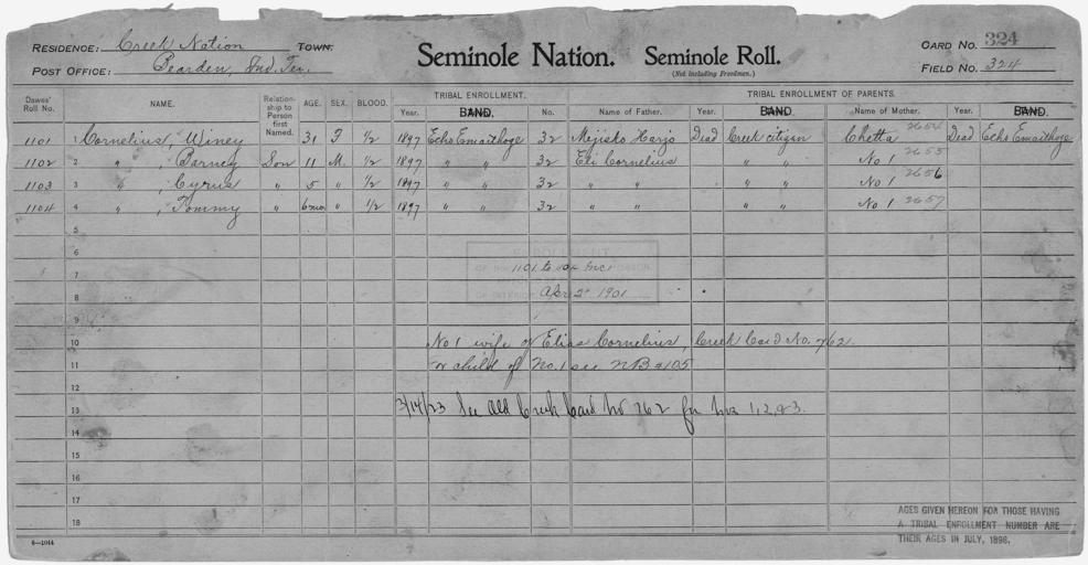 | Keywords: Enrollment for Seminole Census Card 324 - NARA - 267898.jpg Scope and content Name Chetta Type Parent Sex Female City of Residence ee Name Barney Cornelius Type By Blood Age 11 Sex Male Degree Indian Blood 1/2 Roll Number 1102 City of Residence ee Name Cyrus Cornelius Type By Blood Age 5 Sex Male Degree Indian Blood 1/2 Roll Number 1103 City of Residence ee Name Eli Cornelius Type Parent Sex Male City of Residence Creek Name Tommy Cornelius Type By Blood Age 1 Sex Male Degree Indian Blood 1/2 Roll Number 1104 City of Residence ee Name Winey Cornelius Type By Blood Age 31 Sex Female Degree Indian Blood 1/2 Roll Number 1101 City of Residence ee Name Mejisko Harjo Type Parent Sex Male City of Residence Creek General notes 267898 Local identifier 75-53A-SEMINOLE 324 Department of the Interior Office of Indian Affairs Office of the Commissioner to the Five Civilized Tribes 1893 - 1914 NARA's Southwest Region Fort Worth NRFA 1400 John Burgess Drive Fort Worth TX 76140 Record group Record Group 75 Records of the Bureau of Indian Affairs 1793 - 1999 Record group ARC 404 Enrollment Cards compiled 1898 - 1914 Series ARC 251747 File unit File unit ARC Variant control numbers NAIL Control Number NRFF-75-53A-27621<br /> NAIL Control Number NRFF-75-53A-28870<br /> NAIL Control Number NRFF-75-53A-28871<br /> NAIL Control Number NRFF-75-53A-28872<br /> NAIL Control Number NRFF-75-53A-28881<br /> NAIL Control Number NRFF-75-53A-28882<br /> NAIL Control Number NRFF-75-53A-34724<br /> NAIL Control Number NRFF-75-53A-SEMINOLE 324 Other versions <gallery> File Enrollment_for_Seminole_Census_Card_324_-_NARA_-_267898 tif tif File Enrollment_for_Seminole_Census_Card_324_-_NARA_-_267898 jpg jpg </gallery> NARA-cooperation PD-USGov Seminole census cards |
