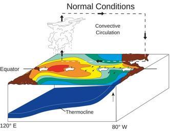 | Keywords: ENSO - normal.svg ENSO normal state Normal equatorial winds warm as they flow westward across the Pacific Cold water is pulled up along west coast of South America Warming water is pushed toward west side of Pacific Sea surface is warm in the west Hot air rises in western Pacific travels eastward and cool air descends on South America ---- Derived from NOAA / PMEL / TAO diagrams http //www pmel noaa gov/tao/proj_over/diagrams/index html 2014-09-07 13 25 32 own Fred the Oyster v PD-USGov DEFAULTSORT Circulation normal El Nino La NiƱa Oceanographic diagrams Climatological diagrams SVG diagrams in English Sea surface temperature maps Uploaded with UploadWizard Images created by Fred the Oyster |