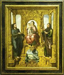 | Keywords: Enthroned Virgin and Child with SS. James the Greater and James the Lesser.jpg Madonna a trónon idősebb és ifjabb Szent Jakabbal 1569 Oil on canvas Institution Bode-Museum collection Solly accession number Kat II 106 object history ProvenanceEvent acquisition 1821 Bode-Museum credit line own ; Photo by Szilas in the Bode-Museum PD-old-100 Paintings in the Bode-Museum Claeissens Pieter Claeissens I 16th-century paintings of Madonna and Child Paintings of Maestà 1569 oil on canvas paintings 16th-century oil paintings of women 16th-century paintings of Saint James the Greater Paintings of Saint James the Less |