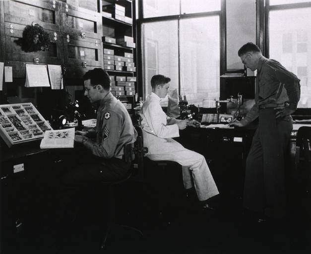| Keywords: Entomology Preparation and Classification Laboratory.jpg en Military personnel studying insects From http //ihm nlm nih gov/luna/servlet/detail/NLMNLM~1~1~101394462~145119 -Laboratory-with-three-men-in-unifo Source Picture caption Entomology Preparation and Classification Laboratory 22 Jan 44 --verso of photograph 1944 http //ihm nlm nih gov/luna/servlet/detail/NLMNLM~1~1~101394462~145119 -Laboratory-with-three-men-in-unifo Laboratory with three men in uniform Images from the History of Medicine U S National Library of Medicine Author The National Library of Medicine believes this item to be in the public domain other versions PD-USGov Uploaded with UploadWizard Insecta specimens Entomologists at work 1944 photographs Three men |