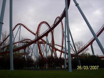 Keywords: Entrañas.jpg en Dragon Khan near view es Visión de las entrañas de la montaña rusa own Sotti 2007-03-26 Chek out my photos here https //picasaweb google com/sottti Cc-zero Dragon Khan Ferrocarril Tour