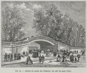 | Keywords: Entrée du jardin des Tuileries, du côté du quai, 1858.jpg In the 19th century the Tuileries gardens offered Parisians and tourists alike a peaceful setting featuring small bodies of water public walkways various terraces and pavilions as well as numerous statues all of which made the gardens the ideal setting for leisure activities The Tuileries Gardens continue to attract visitors today and are located adjacent to the Louvre in the first arrondissement 1875-1882 lithograph 9 5 x 12 1 cm Institution Brown University Library object history exhibition history credit line L'entrée du coté du quai des Tuileries passe sous la Terrasse du Bord de l'Eau accession number 1189455795328125 PD-old-100 Jardin des Tuileries in art Terrasse du Bord-de-l'Eau 1858 Paris à travers les âges 1858 in Paris Lithographs of Paris Lithographs of gardens Images of Paris from the Brown University Library |