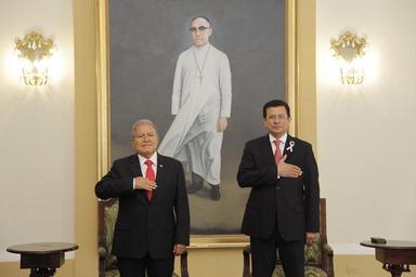 | Keywords: groupshot people indoor speaker Salvador Sanchez Ceren , Presidente de El Salvador (izq.) junto al Canciller de El Salvador,Hugo Martinez (der.) , entonan el himno nacional de El Salvador , durante el acto de entrega de cartas credenciales de embajadores concurrentes. Salvador Sanchez Ceren , Presidente de El Salvador (izq.) junto al Canciller de El Salvador,Hugo Martinez (der.) , entonan el himno nacional de El Salvador , durante el acto de entrega de cartas credenciales de embajadores concurrentes. |