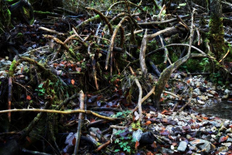 Keywords: environment nature damage forest storm tangle wood tree trunks aesthetic tribe road branches dead broken old gnarled dead plant fractal waldsterben mood atmosphere end time environmental protection disaster