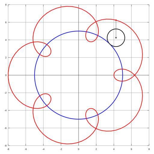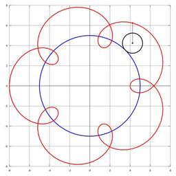 | Keywords: Epitrochoid512.svg Epitrochoid made with gnuplot see code below whose parametric equations are <math>x R + r \cos\theta - d\cos\left R + r \over r \theta\right \ </math> <math>y R + r \sin\theta - d\sin\left R + r \over r \theta\right \ </math> where <math>R 5</math> <math>r 1</math> <math>d 2</math> Own 2008-01-26 Ote Gnuplot code <pre> R 5 0 r 1 0 d 2 0 a pi/4 set size ratio -1 set nokey set nox2tics set noy2tics set zeroaxis lt -1 set grid set noborder set style line 1 linecolor 3 linewidth 3 set style line 2 linecolor -1 linewidth 3 set style line 3 linecolor 1 linewidth 3 set style line 4 linecolor 1 linewidth 5 pointtype 0 set style line 5 linecolor -1 linewidth 5 pointtype 0 set style line 6 linecolor -1 linewidth 1 set arrow from R+r cos a R+r sin a to R+r cos a - d cos R+r a/r R+r sin a - d sin R+r a/r nohead ls 6 set parametric set samples 300 x1 t R cos t y1 t R sin t x2 t R+r cos a +r cos t y2 t R+r sin a +r sin t x3 t R+r cos t - d cos R+r t/r y3 t R+r sin t - d sin R+r t/r plot x1 t y1 t ls 1 x2 t y2 t ls 2 x3 t y3 t ls 3 '-' using R+r cos a - d cos R+r a/r R+r sin a - d sin R+r a/r ls 4 '-' using R+r cos a R+r sin a ls 5 0 0 e 0 0 e </pre> Epitrochoid Gnuplot diagrams |