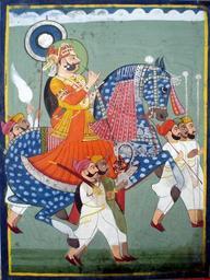 | Keywords: Equestrian portait of Maharaja Man Singh of Jodhpur.jpg en Equestrian portait of Maharaja Man Singh of Jodhpur from between 1820 to 1840 The Maharaja rides his dappled horse whilst smoking a silver hookah held by an attendant in the foreground where another carries a sword To the front of the horse - between its raised hooves actually - are three other attendants two with silver staffs and one with a spear To the rear are two more attendants one with a chauri - fly whisk - the other with a disc-shaped banner with concentric circles of blue and silver http //www indianminiaturepaintings co uk/Jodhpur 20Man 20Singh 20equestrian htm 1 author between 1820 to 1840 Man Singh of Marwar PD-old-100 |
