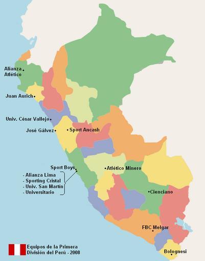 | Keywords: Equipos Peru 2008.png es Ubicación geográfica de los equipos de fútbol de la Primera División del Perú 2008 en Location of the peruvian soccer teams of Primera División 2008 own Fvmeteo 2008-06-23 Dominio público Association football clubs of Peru Maps in Spanish |