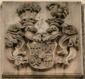 Keywords: Erb Larisch-Mönnichů, zámek Fryštát.JPG cs Kamenný rodový erb Larisch-Mönnichů na přední straně zámku Fryštát v Karviné own Hellooo 2013-08-21 Fryštát chateau Coats of arms of Larisch von Moennich family