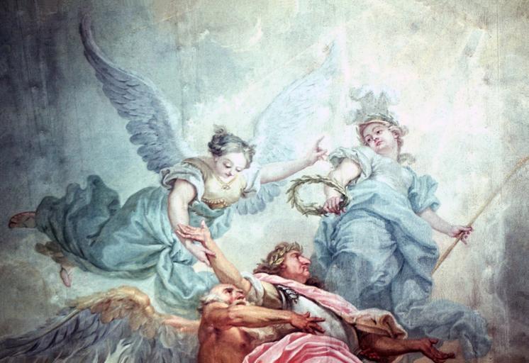 | Keywords: Erhebung des Großen Kurfürsten in den Olymp (van Loo) - der Kurfürst mit Chronos, Victoria und Minerva.jpg The Elevation of the Great Elector into Olympus Oil on canvas destroyed in World War II Ceiling painting detail the Great Elector with Chronos Victoria and Minerva City Palace Potsdam Die Erhebung des Großen Kurfürsten in den Olymp Öl auf Leinwand Kriegsverlust Deckengemälde Ausschnitt der Große Kurfürst mit Chronos Victoria und Minerva Stadtschloss Potsdam 1751 20366819 LAC 9 003/34 fmlac9003_34 <br /> Foto Peter Cürlis; color ; Aufnahme-Datum um 1944 04/1944 08; Zugang Dauerleihgabe Kunsthistorisches Institut der Universität Mainz Fotoinhalt Ausschnitt der Kurfürst mit Chronos Victoria und Minerva artwork Creator Charles-Amédée-Philippe van Loo file James Steakley Die Erhebung des Großen Kurfürsten in den Olymp van Loo PD-old-100-1923 The Elevation of the Great Elector into Olympus van Loo Paintings of Minerva Victoria goddess Chronos |