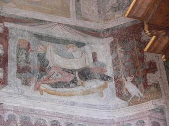 | Keywords: Eriskirch Malereien Chor 21 Noahs Schande.jpg Spätgotische Seccomalereien in der Pfarrkirche Unserer Lieben Frau Eriskirch<br /> Bezeichnung und Numerierung nach Jürgen Michler <br /> Linke nördliche Chorwand am à bergang zur Altarwand Feld Nr 21<br /> Noahs Schande und Verspottung own own photograph Painting c 1410 “1420; Photo February 2010 Painting anonymous Photo Andreas Praefcke Own work all rights released Public domain Fresco-secco paintings in Pfarrkirche Eriskirch Drunken Noah Photos by User AndreasPraefcke |