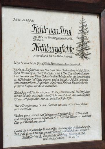 Keywords: Erklärungstafel bei der Notburgafichte.jpg of the Notburgafichte near the Notburgafichte The Notburgafichte is the highest spruce of Tyrol standing near the Rottenburg in Buch in Tirol its hight is indicated by different sources with 53 to 58m It is a protected natural monument in Tyrol with number ND_9_38 own 2012-12-30 Hermann Hammer User Haneburger en You are free to use the picture if you want mention Hermann Hammer as author de Freie Verwendung als Autor kann man Hermann Hammer angeben FoP-Austria <gallery>File Notburgafichte jpg Die Notburgafichte</gallery> Cc-zero Images by Haneburger Natural monuments in Bezirk Schwaz Buch in Tirol |