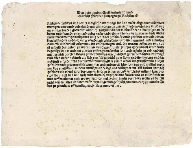 | Keywords: Ernst und Albrecht von Sachsen Ausschreibung 1485.jpg Ernst von Sachen und Albrecht von Sachsen Ausschreibung die Vorbereitung zu einem Kriegszug betreffend Formular für Städte Einblattdruck 1 S Zwickau 17 III 1485 Gedruckt Leipzig Conrad Kachelofen 1485 GW 9387 http //www bassenge com/ Galerie Bassenge 1485 Printer Conrad Kachelofen PD-old-100 Images from Galerie Bassenge 1485 documents Incunabula Ernest Elector of Saxony Albert III Duke of Saxony Konrad Kachelofen | ||||