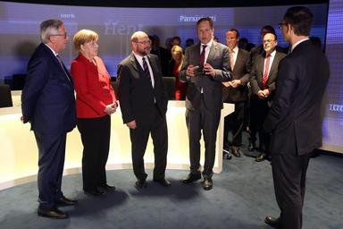 | Keywords: berlin germany BERLIN, GERMANY - MAY 12: (L to R) European Commission President Jean-Claude Juncker, German Chancellor Angela Merkel, Martin Schulz, president of the European Union Parliament, and Frank Piplat, head of the information office of the European Parliament in Germany, participate in the re-opening of the European House and in the inauguration of "Europa Experience The Exhibition" in the European House Berlin. (Photo by Adam Berry/EU/AFP-Service) BERLIN, GERMANY - MAY 12: (L to R) European Commission President Jean-Claude Juncker, German Chancellor Angela Merkel, Martin Schulz, president of the European Union Parliament, and Frank Piplat, head of the information office of the European Parliament in Germany, participate in the re-opening of the European House and in the inauguration of "Europa Experience The Exhibition" in the European House Berlin. (Photo by Adam Berry/EU/AFP-Service) |