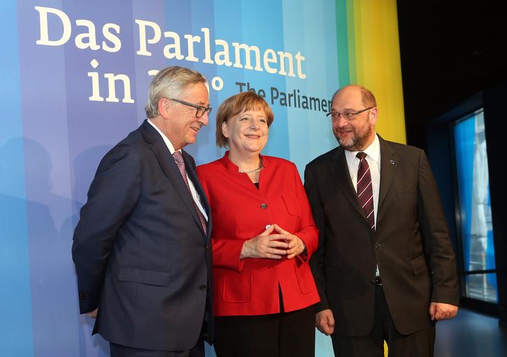 Keywords: berlin germany BERLIN, GERMANY - MAY 12: (L to R) European Commission President Jean-Claude Juncker, German Chancellor Angela Merkel and Martin Schulz, president of the European Union Parliament, participate in the re-opening of the European House and in the inauguration of "Europa Experience The Exhibition" in the European House Berlin. (Photo by Adam Berry/EU/AFP-Service) BERLIN, GERMANY - MAY 12: (L to R) European Commission President Jean-Claude Juncker, German Chancellor Angela Merkel and Martin Schulz, president of the European Union Parliament, participate in the re-opening of the European House and in the inauguration of "Europa Experience The Exhibition" in the European House Berlin. (Photo by Adam Berry/EU/AFP-Service)