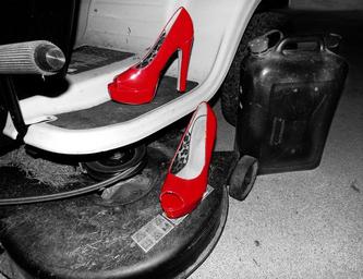 Keywords: erotic red black clothing shoe female meadow grass seduce high heels paragraphs high agriculture