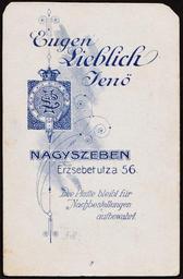 | Keywords: Erzsébet utca 56., Lieblich Jenő fényképész. Fortepan 81245.jpg Check categories 2016 August 28 hu Erzsébet utca 56 Lieblich Jenő fényképész Location Romania Transylvania Sibiu Tags verso photographer studio Title Erzsébet utca 56 Lieblich Jenő fényképész http //www fortepan hu/_photo/download/fortepan_81245 jpg 1900 Fortepan 81245 http //www fortepan hu/_photo/download/fortepan_81245 jpg http //www fortepan hu/ lang en img 81245 Unknown The release at fortepan hu is CC-BY-SA-3 0 As the photographer is unknown or pseudonymous and the photograph is Age 1900 01 01 years old it is considered public domain both in the country of publication Hungary and the USA where Wikimedia Commons is hosted See Fortepan HU for more information on related uploads PD-anon-70-EU PD-1923 PD-1923 DEFAULTSORT Fortepan 081245 1900 photographs Images uploaded by Fæ |