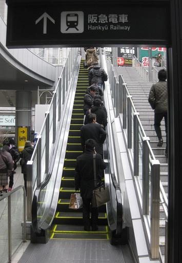 Keywords: Escalator in Umeda.jpg en A escalator in Umeda Osaka Japan ja 大阪市北区梅田(JR大阪駅と阪 梅田駅の 絡 路)のエスカレーター 左空け の例 Own Kyoww 2011-03-17 Cc-zero Train station escalators in Japan Umeda Osaka Arrow signs in Japan
