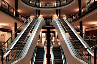 Keywords: escalator stairs metal segments architecture building lighting passenger transport handrails light movement commercial building shopping center escalators emergence germany shiny steel metal glass modern consumption lights lamps