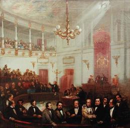 | Keywords: Escena congreso de los diputados siglo XIX Eugenio Lucas Velázquez.jpg El lienzo representa el desarrollo de un acto parlamentario en el Salón de Sesiones del Congreso de los Diputados de España a mediados del siglo XIX Circa 1854-1855 oil canvas Size cm Institution Palacio de las Cortes Madrid object history exhibition history credit line accession number http //narros congreso es/visitanueva/fondos jsp fm 1 fc 1 mp 3 PD-old-100 Eugenio Lucas Velázquez Paintings in the Palacio de las Cortes Spain in the 1850s Politics in art |