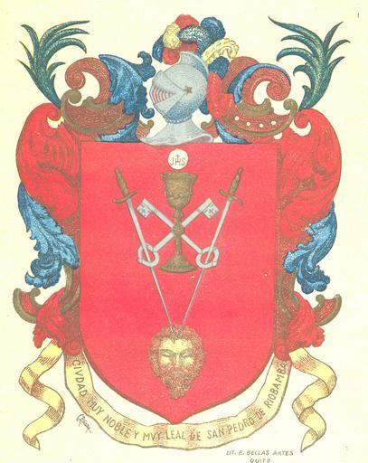 | Keywords: Escudo de Riobamba (Ecuador).jpg es Escudo de Armas de la Ciudad de Riobamba Ecuador La forma de este escudo es la española antigua usada en época de la colonia Lleva un cáliz de oro en el centro del campo hacia arriba con una Hostia elevada A modo de Cruz de San Andrés van en medio y detrás del cáliz dos llaves cruzadas de San Pedro y desde los dos lados altos del escudo bajan puestas en ángulo dos espadas desnudas una por cada lado que pasan respectivamente por los aros de las llaves y se clavan juntas las puntas en el frontal superior de la Cabeza del luterano muerto la cual queda a la puna baja del escudo como en el palo con el cáliz y la hostia todo en campo de gules Diapositiva de Consulta y acceso publico cuya información fue investigada de un libro y/o ejemplar de revisión custodiado en los Fondos Bibliográficos Sección Historia del Ecuador o Etapa Colonial del Archivo Histórico del Guayas; Guayaquil Ecuador Consultado y compartido por el usuario Jodison Javier García Alcivar http //www gadmriobamba gob ec/index php option com_content view article id 73 Itemid 150 Escudo de Armas de Riobamba - Ilustre Municipalidad de Riobamba 2012-08-22 own Jojagal cc-zero Uploaded with UploadWizard Riobamba History of Ecuador Coats of arms of cantons of Chimborazo Human heads in heraldry Coats of arms of the Viceroyalty of New Granada |