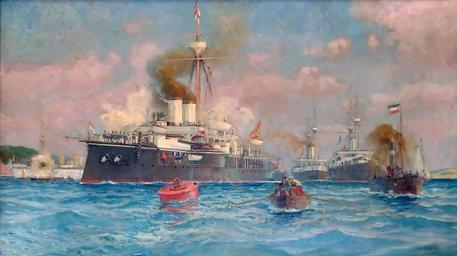 | Keywords: Eskadermanöver in Kiel (Alexander Kirchner, 1890).jpg en Squadron drill of SMS Kronprinz Erzherzog Rudolf SMS Kronprinzessin Erzherzogin Stephanie SMS Kaiser Franz Joseph I and SMS Tiger at Kiel oil on canvas de K u K Eskader bestehend aus den Schiffen Kronprinz Erzherzog Rudolf Kronprinzessin Erzherzogin Stephanie Kaiser Franz Joseph I und Tiger anlässlich der deutschen Flottenmanöver im Jahre 1890 in Kiel Öl auf Leinwand own Creator Alexander Kircher 1890 Note color-corrected photograph may not exactly reflect original color Kronprinz class battleship Alexander Kircher PD-old-auto 1939 |