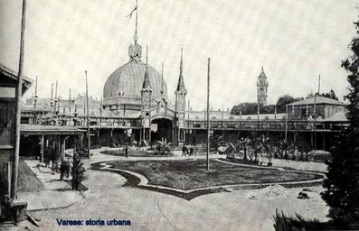 Keywords: Dietro la cupola รจ visibile palazzo Estense sormontato dall'aquila (animale araldico della famiglia Este) a destra emerge il campanile di San Vittore. varese esposizione1901 giardinipubblici