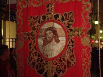 Keywords: Estandarte Paso Encarnado.JPG Estandarte titular del Paso Encarnado Semana Santa de Lorca Own 2008-03-14 Awuachumele Holy Week in Lorca Religious standards in Spain