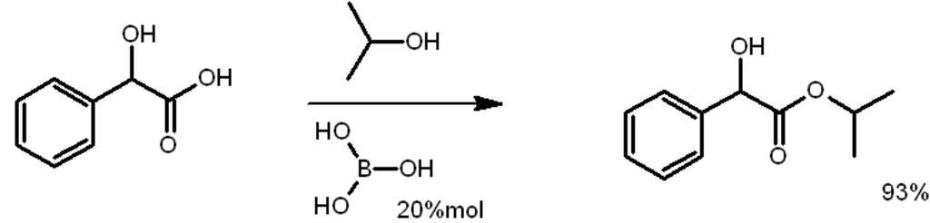 | Keywords: Estryfikacja.png en Reaction of esterification of mandelic acid catalysed by boric acid to form Isopropyl Mandelate pl Reakcja esteryfikacji kwasu migdałowego izopropanolem katalizowana kwasem borowym z utworzeniem migdalanu izopropylu own Moja praca / own work Filips Filip Stefaniak Cc-zero Esterification |