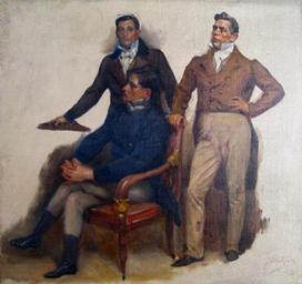 | Keywords: Estudo de figuras humanas para a tela Cortes Constituintes de 1821 (José Ferreira de Moura, Agostinho José Freire, Manuel Borges Carneiro) - Veloso Salgado, 1920.png pt Estudo de figuras humanas para a tela Cortes Constituintes de 1821 de Veloso Salgado As três personagens são José Joaquim Ferreira de Moura o do meio representado de corpo inteiro está sentado numa cadeira de espaldar forrada de tecido vermelho com ornatos dourados nos braços recostado de pernas cruzadas e mãos juntas sobre o joelho esquerdo apresenta-se de frente para o espectador voltado a três quartos para a esquerda olhando na mesma direcção e veste farda de oficial de casaco azul escuro sem galões ou divisas calças claras e botas pretas de cano alto Agostinho José Freire o da esquerda está de pé representado a meio corpo de frente para o espectador representado em posição frontal vestindo casaco castanho e apoiando a mão direita nas costas de uma cadeira de pintura inacabada Manuel Borges Carneiro o homem da direita representado de corpo inteiro de frente para o espectador em posição frontal contraposta apoia a mão direita sobre as costas da cadeira da personagem sentada tem a mão oposta na anca veste fraque castanho dourado calças beges e sapatos rasos pretos Assinado e datado no canto inferior esquerdo V Salgado 1920 en Study of human figures for the painting The Constituent Courts of 1821 by Veloso Salgado The three characters are José Joaquim Ferreira de Moura the man in the middle depicted at full length sitting on a char with red upholstery sitting back with crossed legs and hands together over his left knee turned three-quarters to the left and looking in the same direction and wearing an officer's uniform with a dark blue coat with no decorations light trousers and black boots Agostinho José Freire the man on the left standing depicted at half-length and facing the viewer wearing a brown coat and with his right hand on the back of an unfinished chair and Manuel Borges Carneiro the man to the right depicted at full length facing the viewer with his right hand on the back of José Ferreira de Moura's chair and the other hand on his hip with a golden-brown coat beige trousers and black shoes Signed and dated on the lower left corner V Salgado 1920 1920 http //museu parlamento pt/MatrizWebAR/Objectos/ObjectosConsultar aspx IdReg 515 EntSep 5 MatrizPix - Museu da Assembleia da República Creator Veloso Salgado other versions Estudo de figuras humanas para a tela Cortes Constituintes de 1821 Agostinho José Freire - Veloso Salgado 1920 png Estudo de figuras humanas para a tela Cortes Constituintes de 1821 Manuel Borges Carneiro corpo inteiro - Veloso Salgado 1920 png Estudo de figuras humanas para a tela Cortes Constituintes de 1821 José Ferreira de Moura - Veloso Salgado 1920 png Custom license marker 2016 10 30 PD-old-70 José Joaquim Ferreira de Moura Agostinho José Freire Manuel Borges Carneiro Studies for As Cortes Constituintes de 1821 Veloso Salgado |