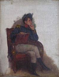 | Keywords: Estudo de figuras humanas para a tela Cortes Constituintes de 1821 (Matias José Dias Azedo) - Veloso Salgado, 1920.png en Estudo de figuras humanas para a tela Cortes Constituintes de 1821 de Veloso Salgado A personagem representada é Matias José Dias Azedo uma figura de homem adulto de cabelo escuro curto e ondulado rosto glabro sentado numa cadeira forrada de veludo vermelho com ornatos dourados nos braços de frente para o espectador voltado a três quartos para a direita apoiando a cabeça na mão esquerda e segurando um livro na mão direita com as pernas cruzadas vestindo farda de general casaco azul ultramarino com divisas douradas calças claras e botas pretas de cano alto Assinado e datado V Salgado 1920 pt Study of human figures for the painting The Constituent Courts of 1821 by Veloso Salgado The depicted individual is Matias José Dias Azedo an adult man with dark short wavy hair shaven face sitting on a chair with red velvet upholstery facing the spectator turned three-quarters to the right holding his head on his left hand and holding a book on his right hand with crossed legs and wearing a general's uniform deep blue coat golden trimming light trousers and black boots Signed and dated V Salgado 1920 1920 http //museu parlamento pt/MatrizWebAR/Objectos/ObjectosConsultar aspx IdReg 509 EntSep 5 MatrizPix - Museu da Assembleia da República Creator Veloso Salgado other versions Custom license marker 2016 10 30 PD-old-70 Matias José Dias Azedo Studies for As Cortes Constituintes de 1821 Veloso Salgado |