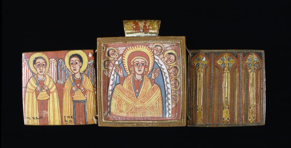 | Keywords: Ethiopian - Double-sided Diptych with Mary at Dabra Metmaq (Front); Saints (Back) - Walters 368 - Side A.jpg The small scale of this painting and its protective covers facilitated its use as a portable icon The hollow wooden cylinder attached to the body allowed the painting to be suspended from the owner's neck The practice of wearing icons of the Virgin as pendants is documented in written sources as early as the fifteenth century The main scene on this doubled-sided pendant commemorates the feast of Däbrä Metmaq According to the Miracles of Mary this feast was instituted to celebrate an event that occurred annually in the church of Dayr al-Magtas Egypt For five days each spring Mary miraculously appeared inside the cupola of the church bathed in light and surrounded by angels The main panel of this icon captures the visionary character of this event by enclosing the Virgin in a band of yellow light Seraphim surround the outer border of red The archangels Michael and Gabriel depicted on the inside cover evoke the heavenly hosts that accompanied the Virgin By representing the major figures the painter recreated the miraculous apparition in miniature for the pendant's owner As the Festival of Däbrä Metmaq was especially important to women and as the reverse of the pendant also bears the likenesses of two female martyr-saints the patron of this work might have been female The legend of the 15th-century saint Krestos Sämra describes how Christ bequeathed to her a painting which he hung pendant-like around her neck The delicately carved painted covers transformed the closed pendant into a cherished object of personal devotion late Other date century 17 Gondarine tempera panel H open 4 3/8 x W 10 1/8 in 11 11 x 25 7 cm ; H closed 4 3/8 x W 3 5/8 in 11 11 x 9 2 cm ; Panel cm 8 09 8 25 accession number 36 8 342 Robert and Nancy Nooter Collection Washington D C date and mode of acquisition unknown Nooter 20 11 Walters Art Museum 1996 by purchase Museum purchase with funds provided by the W Alton Jones Foundation Acquisition Fund 1996 Ethiopian Art at The Walters The Walters Art Gallery Baltimore 1996 Realms of Faith Medieval and Byzantine Art from the Walters Art Museum Frist Center for the Visual Arts Nashville 2001-2002 Realms of Faith Medieval and Byzantine Art from the Walters Art Museum Frist Center for the Visual Arts Nashville 2002-2005 Angels of Light Ethiopian Art from the Walters Art Museum Birmingham Museum of Art Birmingham; Smith College Museum of Art Northampton; Museum of Biblical Art New York 2006-2007 place of origin Gondar Ethiopia Walters Art Museum license 3D Art of Ethiopia in the Walters Art Museum Church paintings in Ethiopia Paintings in the Walters Art Museum Media contributed by the Walters Art Museum needs category review |