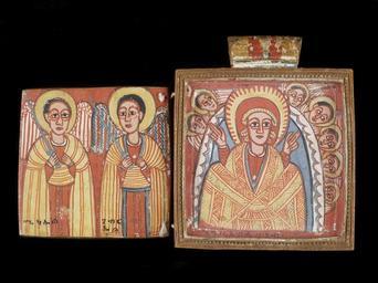 | Keywords: Ethiopian - Double-sided Diptych with Mary at Dabra Metmaq (Front); Saints (Back) - Walters 368 - Open A.jpg The small scale of this painting and its protective covers facilitated its use as a portable icon The hollow wooden cylinder attached to the body allowed the painting to be suspended from the owner's neck The practice of wearing icons of the Virgin as pendants is documented in written sources as early as the fifteenth century The main scene on this doubled-sided pendant commemorates the feast of Däbrä Metmaq According to the Miracles of Mary this feast was instituted to celebrate an event that occurred annually in the church of Dayr al-Magtas Egypt For five days each spring Mary miraculously appeared inside the cupola of the church bathed in light and surrounded by angels The main panel of this icon captures the visionary character of this event by enclosing the Virgin in a band of yellow light Seraphim surround the outer border of red The archangels Michael and Gabriel depicted on the inside cover evoke the heavenly hosts that accompanied the Virgin By representing the major figures the painter recreated the miraculous apparition in miniature for the pendant's owner As the Festival of Däbrä Metmaq was especially important to women and as the reverse of the pendant also bears the likenesses of two female martyr-saints the patron of this work might have been female The legend of the 15th-century saint Krestos Sämra describes how Christ bequeathed to her a painting which he hung pendant-like around her neck The delicately carved painted covers transformed the closed pendant into a cherished object of personal devotion late Other date century 17 Gondarine tempera panel H open 4 3/8 x W 10 1/8 in 11 11 x 25 7 cm ; H closed 4 3/8 x W 3 5/8 in 11 11 x 9 2 cm ; Panel cm 8 09 8 25 accession number 36 8 342 Robert and Nancy Nooter Collection Washington D C date and mode of acquisition unknown Nooter 20 11 Walters Art Museum 1996 by purchase Museum purchase with funds provided by the W Alton Jones Foundation Acquisition Fund 1996 Ethiopian Art at The Walters The Walters Art Gallery Baltimore 1996 Realms of Faith Medieval and Byzantine Art from the Walters Art Museum Frist Center for the Visual Arts Nashville 2001-2002 Realms of Faith Medieval and Byzantine Art from the Walters Art Museum Frist Center for the Visual Arts Nashville 2002-2005 Angels of Light Ethiopian Art from the Walters Art Museum Birmingham Museum of Art Birmingham; Smith College Museum of Art Northampton; Museum of Biblical Art New York 2006-2007 place of origin Gondar Ethiopia Walters Art Museum license 3D Art of Ethiopia in the Walters Art Museum Church paintings in Ethiopia Paintings in the Walters Art Museum Media contributed by the Walters Art Museum needs category review |