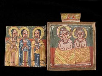 | Keywords: Ethiopian - Double-sided Diptych with Mary at Dabra Metmaq (Front); Saints (Back) - Walters 368 - Open B.jpg The small scale of this painting and its protective covers facilitated its use as a portable icon The hollow wooden cylinder attached to the body allowed the painting to be suspended from the owner's neck The practice of wearing icons of the Virgin as pendants is documented in written sources as early as the fifteenth century The main scene on this doubled-sided pendant commemorates the feast of Däbrä Metmaq According to the Miracles of Mary this feast was instituted to celebrate an event that occurred annually in the church of Dayr al-Magtas Egypt For five days each spring Mary miraculously appeared inside the cupola of the church bathed in light and surrounded by angels The main panel of this icon captures the visionary character of this event by enclosing the Virgin in a band of yellow light Seraphim surround the outer border of red The archangels Michael and Gabriel depicted on the inside cover evoke the heavenly hosts that accompanied the Virgin By representing the major figures the painter recreated the miraculous apparition in miniature for the pendant's owner As the Festival of Däbrä Metmaq was especially important to women and as the reverse of the pendant also bears the likenesses of two female martyr-saints the patron of this work might have been female The legend of the 15th-century saint Krestos Sämra describes how Christ bequeathed to her a painting which he hung pendant-like around her neck The delicately carved painted covers transformed the closed pendant into a cherished object of personal devotion late Other date century 17 Gondarine tempera panel H open 4 3/8 x W 10 1/8 in 11 11 x 25 7 cm ; H closed 4 3/8 x W 3 5/8 in 11 11 x 9 2 cm ; Panel cm 8 09 8 25 accession number 36 8 342 Robert and Nancy Nooter Collection Washington D C date and mode of acquisition unknown Nooter 20 11 Walters Art Museum 1996 by purchase Museum purchase with funds provided by the W Alton Jones Foundation Acquisition Fund 1996 Ethiopian Art at The Walters The Walters Art Gallery Baltimore 1996 Realms of Faith Medieval and Byzantine Art from the Walters Art Museum Frist Center for the Visual Arts Nashville 2001-2002 Realms of Faith Medieval and Byzantine Art from the Walters Art Museum Frist Center for the Visual Arts Nashville 2002-2005 Angels of Light Ethiopian Art from the Walters Art Museum Birmingham Museum of Art Birmingham; Smith College Museum of Art Northampton; Museum of Biblical Art New York 2006-2007 place of origin Gondar Ethiopia Walters Art Museum license 3D Art of Ethiopia in the Walters Art Museum Church paintings in Ethiopia Paintings in the Walters Art Museum Media contributed by the Walters Art Museum needs category review |