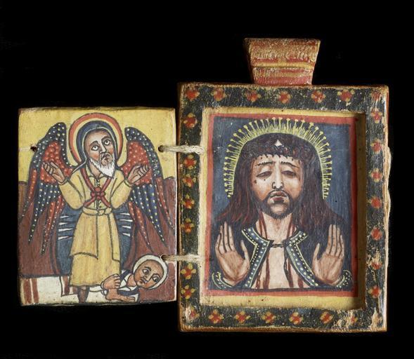 | Keywords: Ethiopian - Front of a Double-Sided Diptych with Mary and Her Son, and Saint George - Walters 365 - Open B.jpg  This small icon was worn around the neck to ward off evil; it could be hung with either side facing out This is a small replica of the famous icon known as the Kwerata Reesu Christ with the Crown of Thorns believed to protect the whole kingdom of Ethiopia Allegiance to the emperor was sworn on the Kwerata Reesu and it accompanied him on military expeditions late Other date century 18 Gondarine tempera wood H with one panel open 3 7/16 x W 4 x D 5/8 in 8 7 x 10 1 x 1 55 cm ; H with two panels open 3 7/16 x W 5 9/16 x D 5/8 in 8 7 x 14 1 x 1 55 cm ; Closed cm 8 7 6 2 1 55 ; Center panel cm 8 89 6 35 ; Folding panels cm 5 87 4 76 accession number 36 5 35663 Knopfelmacher Collection New York date and mode of acquisition unknown Knopfelmacher 1 William Wright Gallery New York date and mode of acquisition unknown Walters Art Museum 1996 by purchase Museum purchase with funds provided by the W Alton Jones Foundation Acquisition Fund 1996 Ethiopian Art at The Walters The Walters Art Gallery Baltimore 1996 Realms of Faith Medieval and Byzantine Art from the Walters Art Museum Frist Center for the Visual Arts Nashville 2001-2002 Realms of Faith Medieval and Byzantine Art from the Walters Art Museum Frist Center for the Visual Arts Nashville 2002-2005 Angels of Light Ethiopian Art from the Walters Art Museum Birmingham Museum of Art Birmingham; Smith College Museum of Art Northampton; Museum of Biblical Art New York 2006-2007 place of origin Gondar Ethiopia Walters Art Museum license 3D Art of Ethiopia in the Walters Art Museum Church paintings in Ethiopia Paintings in the Walters Art Museum Media contributed by the Walters Art Museum needs category review |